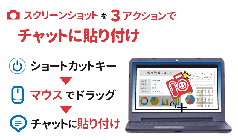 画面clipleはデスクトップ画面をマウスでドラッグした範囲をスクリーンショットして、クリップボードにコピーするWindows専用のソフトウェアです。スクリーンショットしたあと、そのままチャットに貼り付けて送信することができます。